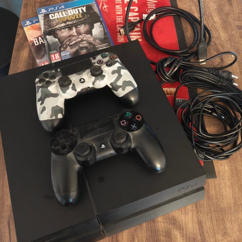 Pakettiin sisältyy playstation 4 500 GB, virtajohto, 2 ohjainta ja playstation kamera. Konsolissa on levyasema