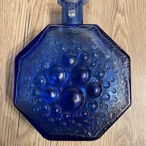 Nanny Stillin Riihimäen Lasille suunnittelema koristepullo/maljakko myynnissä, pohjasta löytyy aito ja alkuperäinen signeeraus, väriltään tyypillisesti meripihkanruskea tai kuparinvärinen. Lasi siisti ja ehjä, käytetty maljakkona, ja mitä tahansa kuvioo lasista löytyykin on alkuperäistä. Suunniteltu vuonna 1959. Valmistettu vuosina 1959–1968. Korkeus päälle 32 cm. Nämä on valmistettu pyörittäen puhaltamalla.