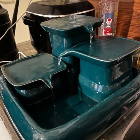 Keraaminen kissan juoma-automaatti. Ostettu miaustoresta. Osat on irroitettavissa ja pestävissä tiskikoneessa. Mukaan saa myös liiketunnistimen, eli lähde aktivoituu, kun kissa tulee lähelle.
