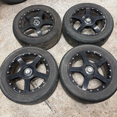 6 pulttisia spaht vanteita. Vanteet kunnossa mutta musta pinnote aika pitkälti irtaallaan. Alla kesärenkaat, 1 käyttökelvoton, 2 kpl 3-4mm kumeja