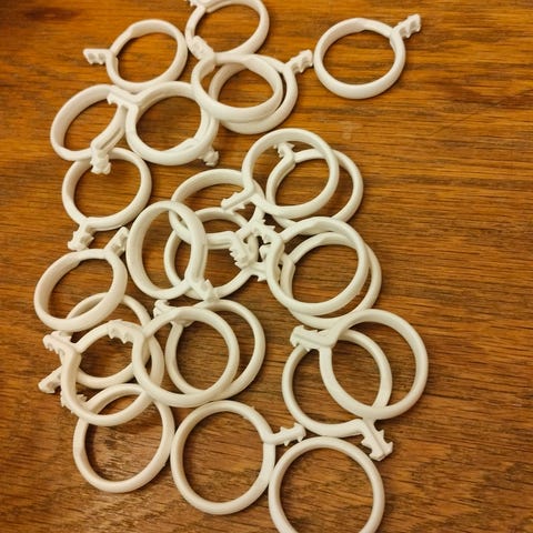 Tarpeettomaksi jääneet hyväkuntoiset valkoiset suihkuverhorenkaat.