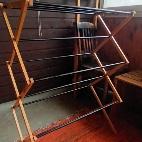 Mustasta metallista valmistettu kuivausteline. Käytettävissä pyykin kuivaamiseen sisätiloissa. Teline voidaan taittaa säilytystä varten.
