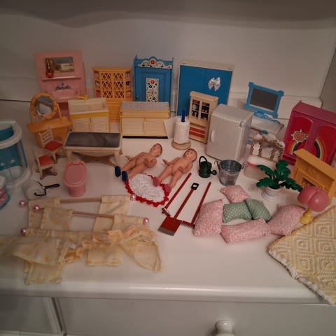 Sekalaiset kalusteet nukkekotiin tms. En yhtään muista mihin settiin ovat joskus kuuluneet.