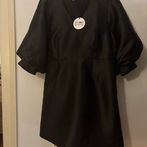 Joelle-mekko, jota yhä myydään Elloksella. Tyköistuva malli, ei mitään kauhean reilua kokoa. Satiinista. V-muotoinen kaula-aukko. Leveät, puolipitkät hihat. Korostettu vyötärö, joustonauhalla vyötärön takaosa. Vetoketju sivulla. Vuorattu. Minulle iso; sen vuoksi myyn. Kai-kai mitta 57 cm. Olkapää-helma -mitta 94 cm.