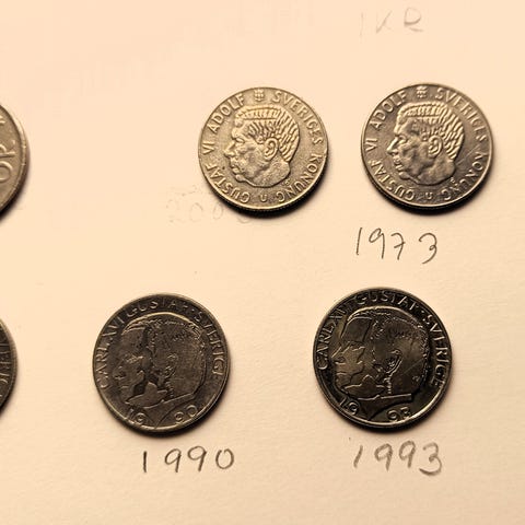 Viisi Norjan 20 kruunun kolikkoa