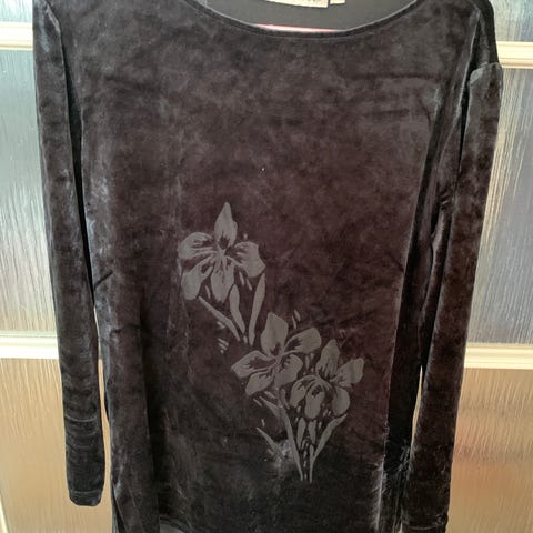 Pusero musta missä punaisin paljetein koristeltu kukkakuvio edessä ylhäällä. Koko M.