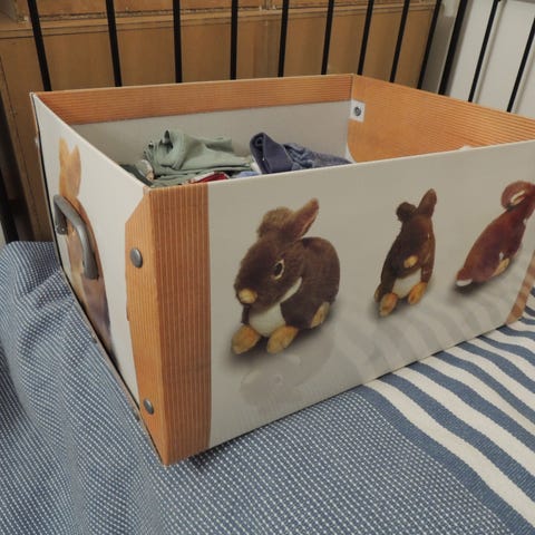 10cm korkuinen pieni nukke, sänky, kaappi, kylpytakki ja muita pieniä tarvikkeita. Mukana myös alkuperäinen pahvinen koti pahvikalusteineen. Nuken päässä pieniä maali(?)täpliä (vikat kuvat) ja tuttipullossa kulumaa.