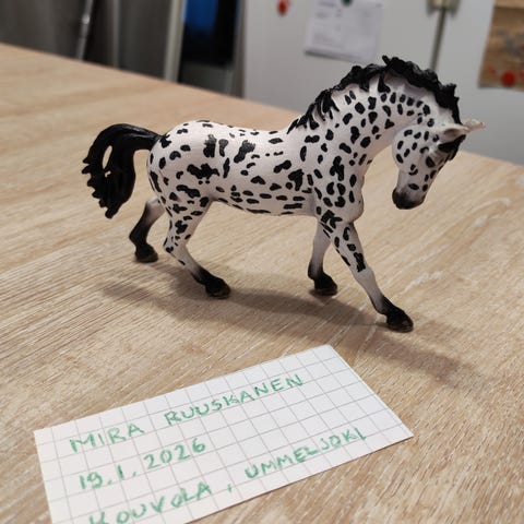 Schleich Knabstrup. Harjassa pientä kulumaa ja etujalassa pieni punainen tussin jälki.