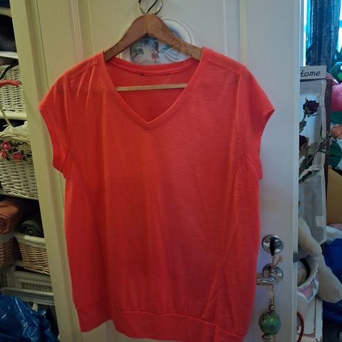 Pusero. Koko XL. Edessä ylhäällä solmittavat nauhat. Oranssihtavanpunainen.