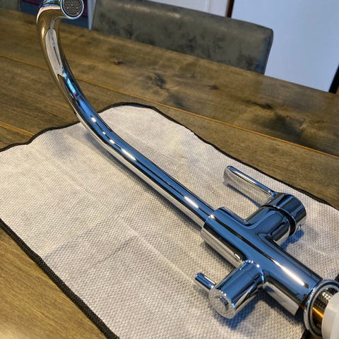 Keittiöhana harmaalla viimeistelyllä, jossa kaksi liitäntäputkea ja metallinen kiinnitysmekanismi.