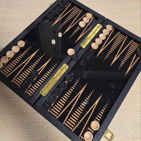 Täysin käsintehty backgammon-lauta, valmistettu saksanpähkinäpuusta, lasinen sisäpaneeli, kaksoislukollinen ovi, alkuperäiset raskaat luunopat, käsintehty nahkakotelo, erikois- ja mittatilaustyönä tehty koko 17 x 35 (suljettuna). Erittäin kaunis