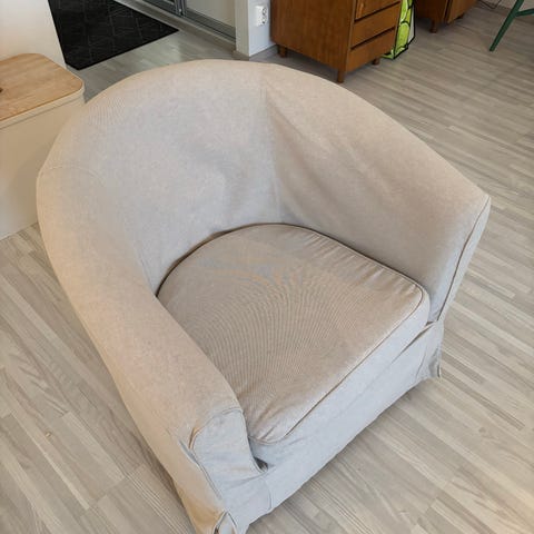 IKEA Tullsta nojatuoli myydään muuton alta. Nojatuolissa on itseommeltu sininen kuvioitu huppu. Huppu on irrotettavissa ja pestävissä. Tuoli on rakenteellisesti ehjä ja huppu on ehjä ja tahraton.