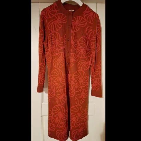 Upea 1960-1970-luvun neulosmaista paksuhkoa kangasta oleva vintagemekko. Kermanvaalealla pohjalla hieno violetti, ajan mukainen kuvio. Kaunis korkea kaulus, selässä vetoketju.