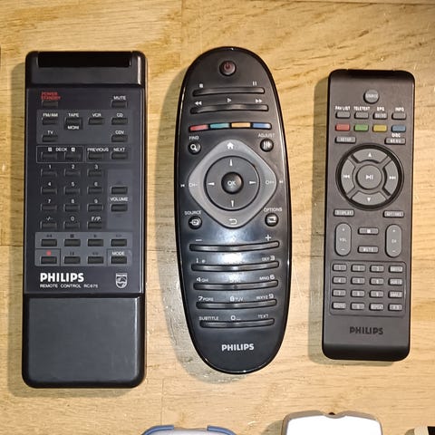 Kuvissa näkyvät, toimivat ja siistikuntoiset, Philips kaukosäätimet (13kpl.) eri tyyppisiin elektroniikka soittimiin, stereot, tv, radio, vhs, dvd, yms. tarpeettomana!