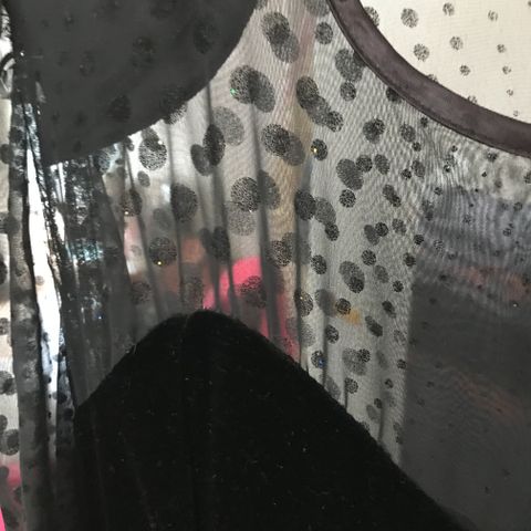 Kaksi mustaa kimaltelevaa mekkoa, ensimmäinen hyvässä kunnossa, toinen kaipaa puhdistusta nukasta, koot M-L