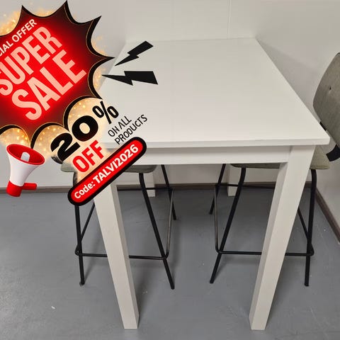 Korkea baaripöytä. Hyvin jykevät, tietääkseni puusta, eivät heilu alla. Kaksi samanlaista tuolia, kuvassa näkyy yksi.