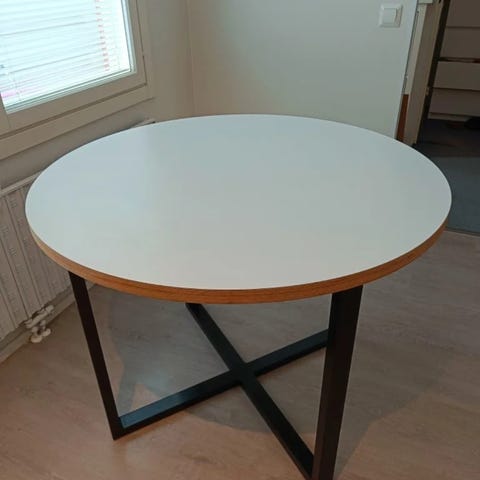 Myydään tarpeettomana pyöreä pöytä, joka on mahdollista jatkaa keskilevyllä lisäpituuden saamiseksi. Pöydän halkaisija on 100cm. Lisäosalla saadaan pöydän pituutta jatketuksi 28cm eli kokonaispituus on 128cm.