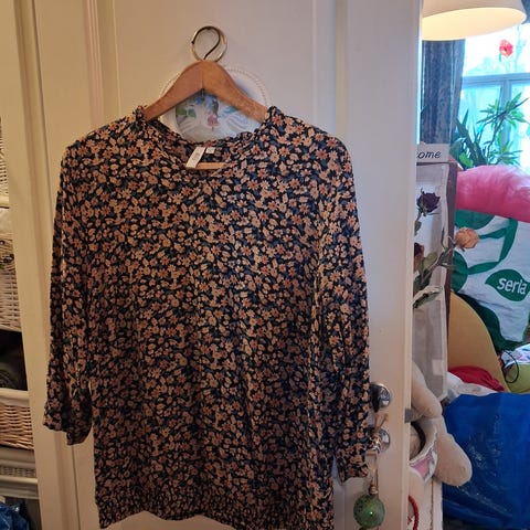 Kukkakuvio pusero. Koko XL. Helmassa,hihansuissa ja kaula-aukossa kuminauharypytykset. Tummansininen pohja.
