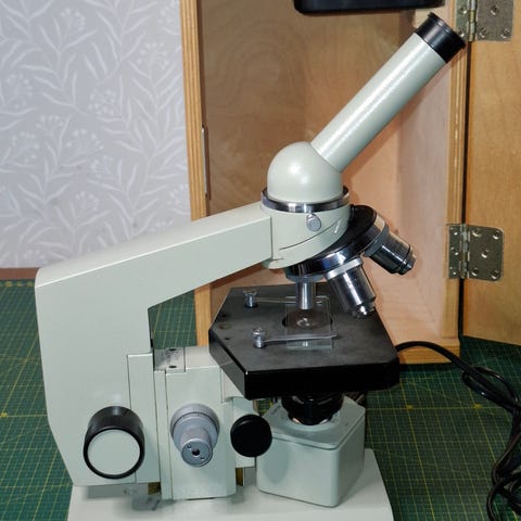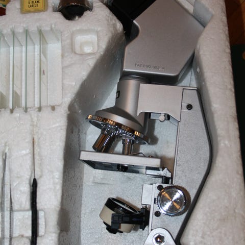 Kaikki osat näkyy kuvissa. Mikroskooppi toimii, mutta ajan patinaa löytyy ja vaatii ainakin puhdistamista. Laite on isoenoni perua.