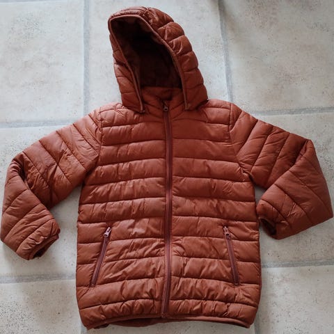 Kevyttoppatakki koko 140. Muuten kunnossa, mutta joitain tahroja jäi pesusta huolimatta. Menee vielä varmasti rymykäytössä.