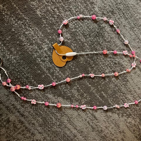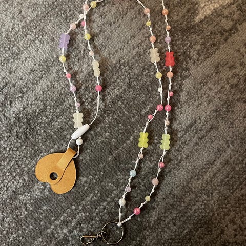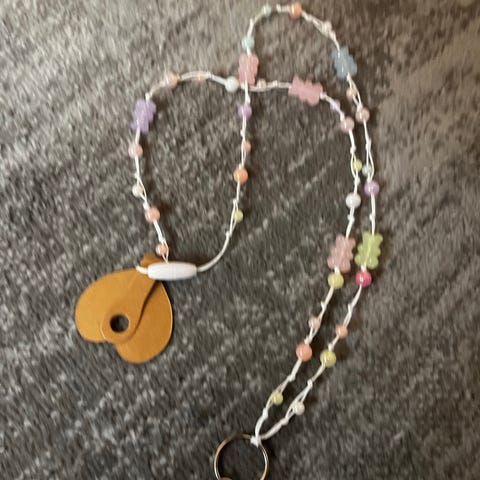 Pitkä ”olan yli” avainnauha turvalukolla ja kilpikonna helmillä. Sopiva noin M-L koolle