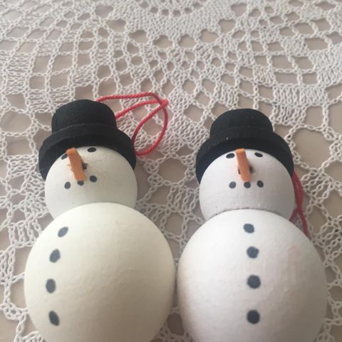 Lumiukkoaiheinen koriste. Takana saranat, joilla lumiukot saa aseteltua haluamallaan tavalla, ei siis tarvitse olla vaakasuorassa.