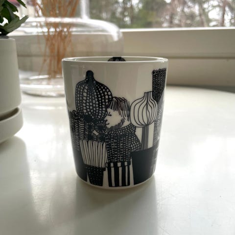 Marimekko viidakko ja Oiva-sarjan Siirtolapuutarha-muki, posliinia. Mukit ovat erikokoisia ja niissä on erilaiset kuviot. Soveltuvat käyttöön kotona tai keräilyesineiksi. Viidakko-muki sopii esim erikoiskahville ja Siirtolapuutarhamuki on peruskoon yleismuki kahville, kaakaolle, teelle tai vaikkapa kuumalle mehulle.