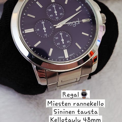 Regal rannekello, musta väri, unisex-malli. Kellossa on metalliranneke ja selkeä kellotaulu, jossa näkyy päivämäärä ja viikonpäivä.