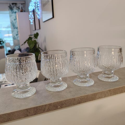 Myydään vanhat, mutta uudenveroiset, naarmuttomat ja puhtaat Riihimäen lasin valmistamat jalalliset Kehrä -lasit,