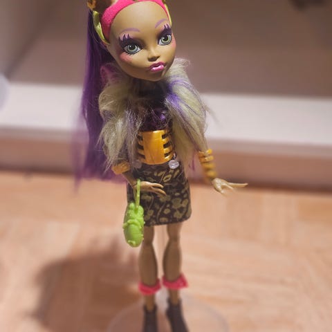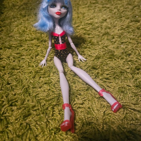 Hiuksiin laitettu hiuslakkaa, että pysyvät kuosissa. Nukke on myös pesty ostamisen jälkeen, ostettu käytettynä.