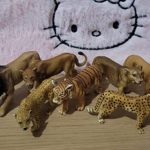 Schleich isoja kissaeläimiä: leijona, gepardi, leopardi, jaguaari, ilves, tiikeri. Lelut ovat leikittyjä ja niissä on joitakin käytönjälkiä. Hinta sisältää kaikki :)