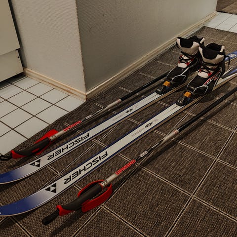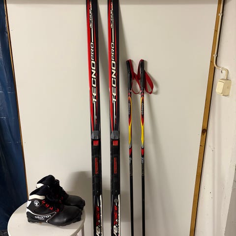 Myynnissä pakettina Peltonen sukset 160, sauvat ja monot, koko 38. NNN siteet.