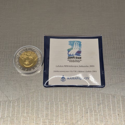 Hyväkuntoinen kolikko säilytysrasiassaan, aiheena Lahden MM-hiihdot 2001. Paino 24g.