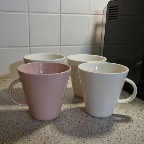 Yhdessä mukissa ilmeisesti lusikan pyörittämisjälkiä sisäpuolella, en tiedä onko poistettavissa, koitettu ottaa kuvat.