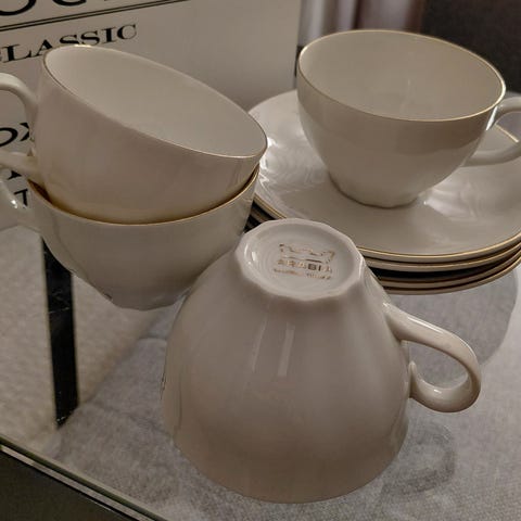 Kahvikupissa pieni riksu pohjassa. Toisessa ilmoituksessa yksi teekuppi myynnissä. Yksi teekupin aluslautanen löytyy myös. Näitä pikkuhiljaa löytyy kaappien siivoamisen myötä.