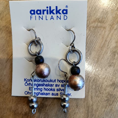 Kuvan korvikset myyntiin. Kuvatessa huomasin jotain pientä ajan patinaa metalliosissa, en ole koittanut puhdistaa. Muissa ilmoituksissa myynnissä paljon Aarikkaa.