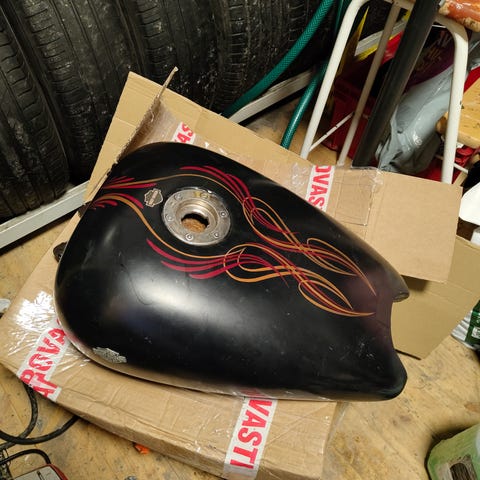 Joku halpis tankki. Kolhunkin saanut jossain vaiheessa. Ei ole ollut käytössä. Lukollinen korkki ja hana löytyy myös.