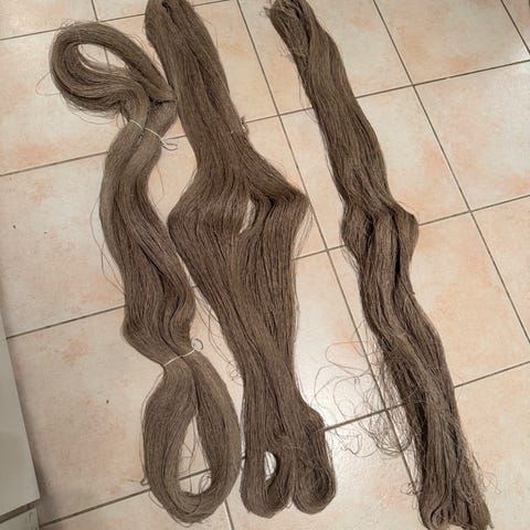 Kerällä olevat pellavalangat, tulitikkuasti kuvastaa kokoa.