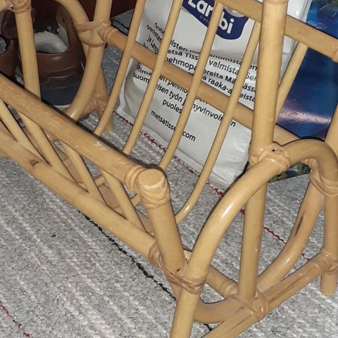 Vintage-lehtiteline, joka on valmistettu rottingista. Tämä teline on suunniteltu pitämään lehdet ja aikakauslehdet järjestyksessä ja helposti saatavilla.Telineessä on näkyvissä jonkin verran kulumaa ja patinaa, mikä on tyypillistä tämän ikäiselle esineelle. Rottinki on säilynyt ehjänä, mutta pinnassa on pieniä naarmuja ja värimuutoksia. Yleiskunto on kuitenkin hyvä ja teline on edelleen täysin käyttökelpoinen.
