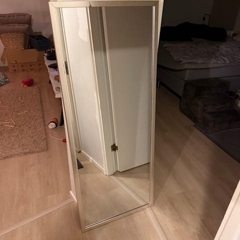Soikea puukehyksinen peili. Korkeus 95cm ja leveys 60cm. Kulkeutuu Kalajoki, Oulu ja Liminka.