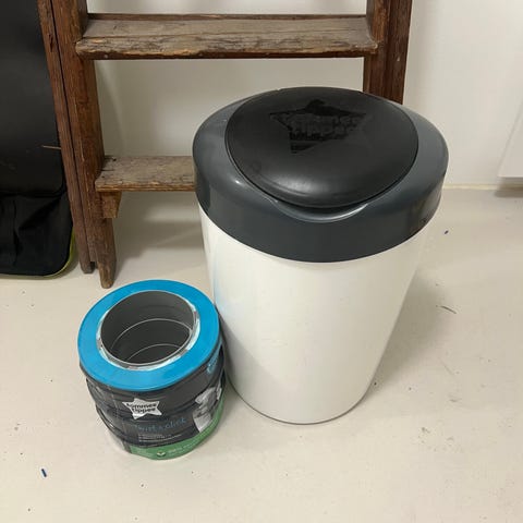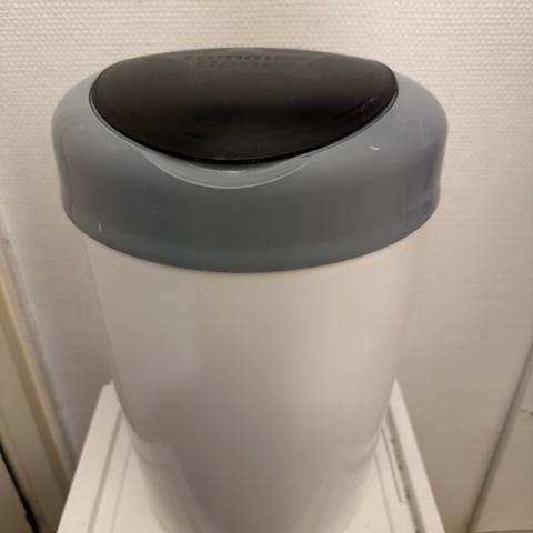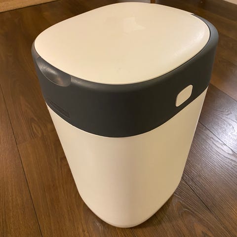 Hyvässä kunnossa oleva vaipparoskis ja kaksi pakettia roskikseen sopivia pusseja.
