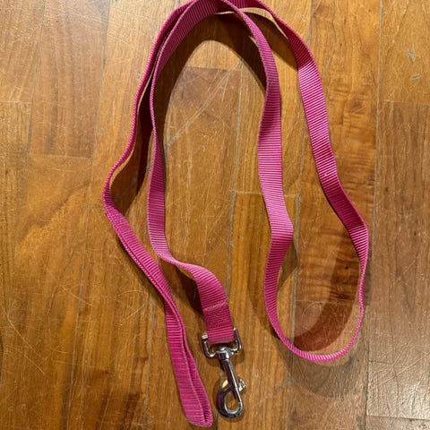 Erilaisia koiran hihnoja eri kokoja ja värejä. Hihnojen pituudet vaihtelevat noin 35 cm, 1 m 50 cm ja 1 m 80 cm. Materiaalit sisältävät tekstiiliä ja nahkaa. Värit sisältävät valkoista, oranssia, mustaa, vaaleanpunaista ja liilaa.