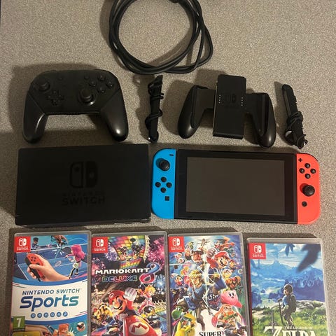 Myynnissä Nintendo Switch ja mukana tulevat alkuperäiset tarvikkeet Joycon-ohjaimeen ja konsoliin. Lisäksi Nintendo Pro Controller-ohjain, latauskaapeli, kantolaukku konsolille ja peleille sekä Metroid Prime Remastered-peli.