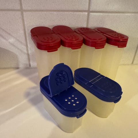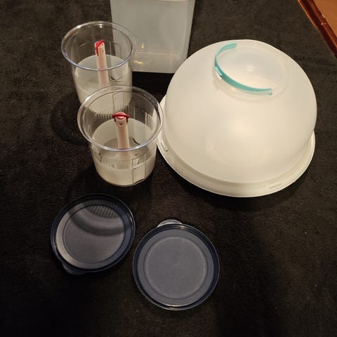 Tupperwaren säilytyslaatikko ja veitset sekä uusi juomapullo.