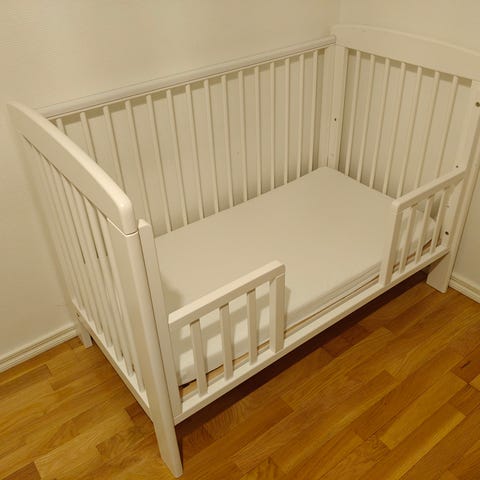 Troll pinnasänky, valkoiseksi maalattua puuta. Sopii hyvin pienestä vauvasta asti, sillä pohjan saa säädettyä kolmeen eri korkeuteen. Ehjä ja hyvin toimiva, maalipinnassa kulumia jotka saa pienellä vaivalla maalattua piiloon. Patjan koko 60 x 120 cm, saa mukaan, sängyn mitat näkyy kuvissa.