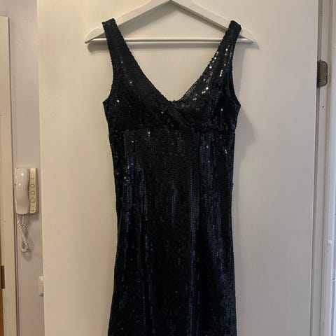 Myydään hyväkuntoinen vihreä paljettimekko, kokoa S. Sisällä ohut vuori. Mekko paksuhkoa kangasta. Mekko pesty käytön jälkeen.