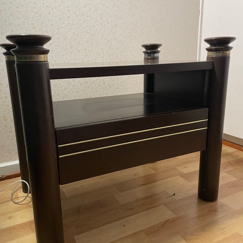 Valkoiset retrot yöpöydät messinkikahvoin 70-luvulta.