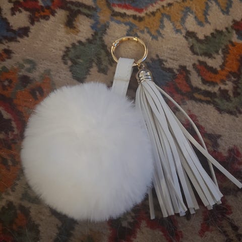 Musta tupsumainen laukkukoriste. Keskellä olevassa mustassa metalliosassa kohokirjoitus SAINT LAURENT PARIS. En usko, että on aito. Hienon ja trendikkään näköinen kuitenkin. Materiaali nahkaa tai tekonahkaa. Tupsuosan pituus noin 13 cm. Kokonaispituus noin 33 cm.