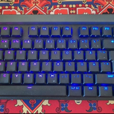 Logitech G915 TKL langaton näppäimistö, jossa on RGB-valaistus ja lightspeed. Näppäimistö on kompakti ja helppo käyttää