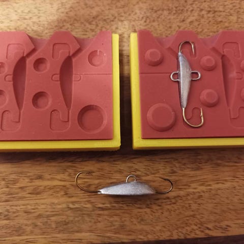 Tasurimuotti 44/74mm/14g Koukkupaikat mitoitettu #4 kamasanille, mutta voihan tuossa koukkupesien ansiosta muutakin koukkua käyttää. Keulaan B175 ja perään B800 Pituus mutkasta mutkaan: 74mm josta rungon osuus: 44mm. Valettavan tasurin paino n.14g riippuen materiaalista.